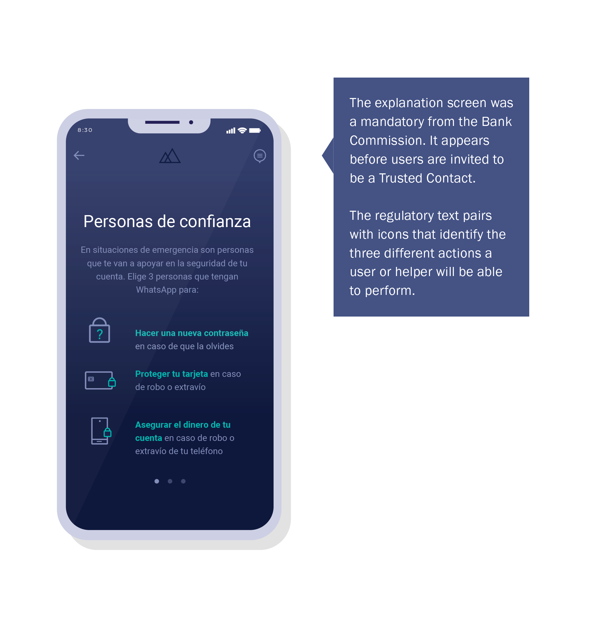 One of our key innovations was creating Trusted Contacts, a program that improves security and usability and creates a great channel for organic growth. The activation process begins when customers deposit over Mx$500 in one month. From there, they add two to three Trusted Contacts who can help them reset their password or block their account in the event their phone is stolen. The contacts must be existing Cuenca customers or sign up for an account — hence the growth opportunity.
