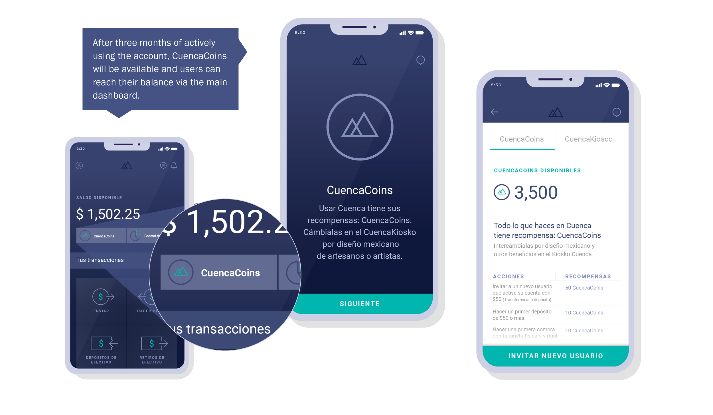One of Cuenca's goals is to balance technology and humanity. We did this by collaborating with artisans whom we asked to design our cards and complimentary card sleeves. These objects have been such a success that many clients seek to purchase them — and their popularity led us to create CuencaCoins. CuencaCoins is a rewards program that allows users to gain credits for specific actions. The most valuable action is inviting new users to activate accounts. Later, users can exchange the CuencaCoins for special-edition cards or sleeves.
