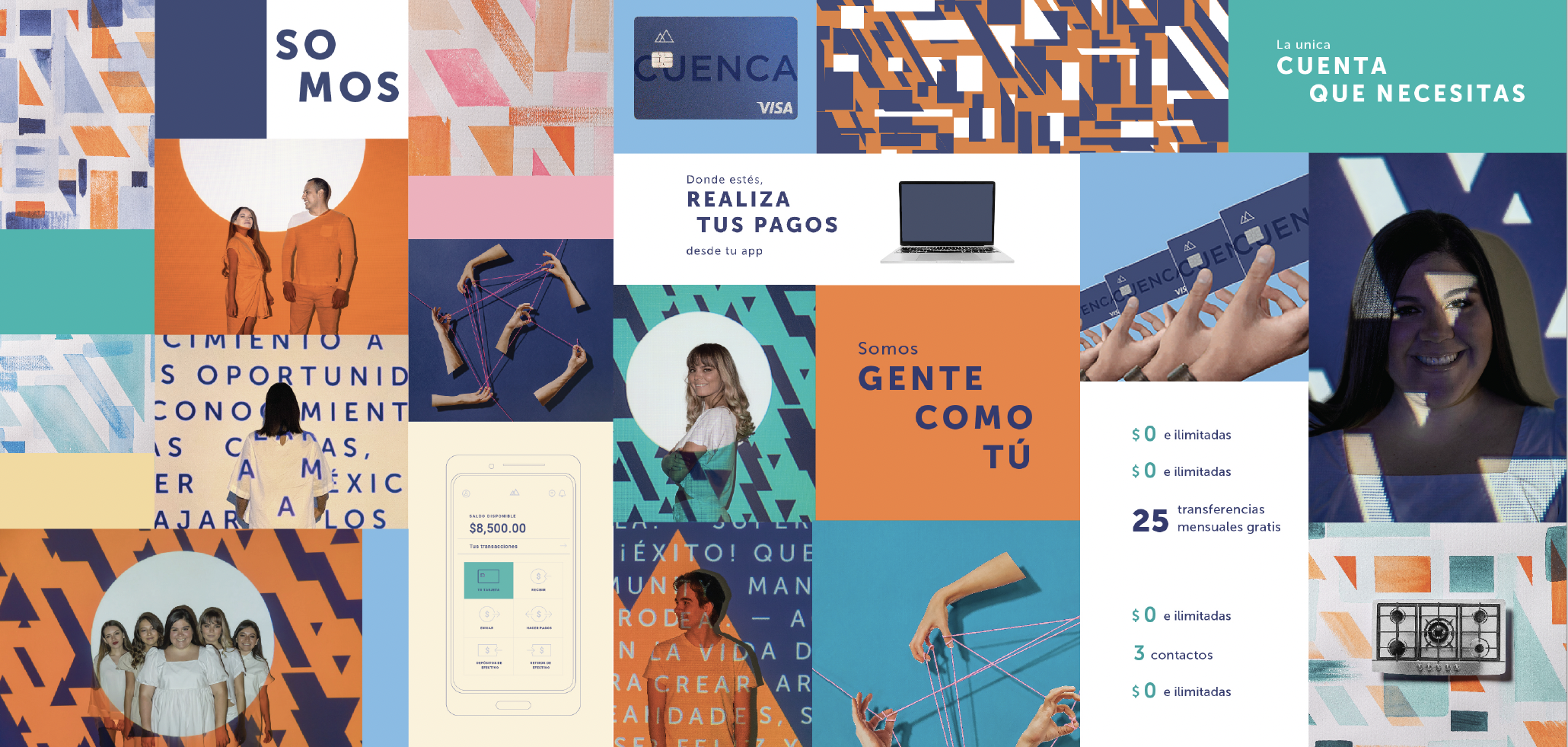 Cuenca is a Mexico City fintech company that provides digital financial services based on trust, inclusion, and innovation. They wanted to humanize the brand, stripping away the techy feel. Mexico is a country in digital transition, so digital services need to establish the possibility of reaching out to a real person if needed.